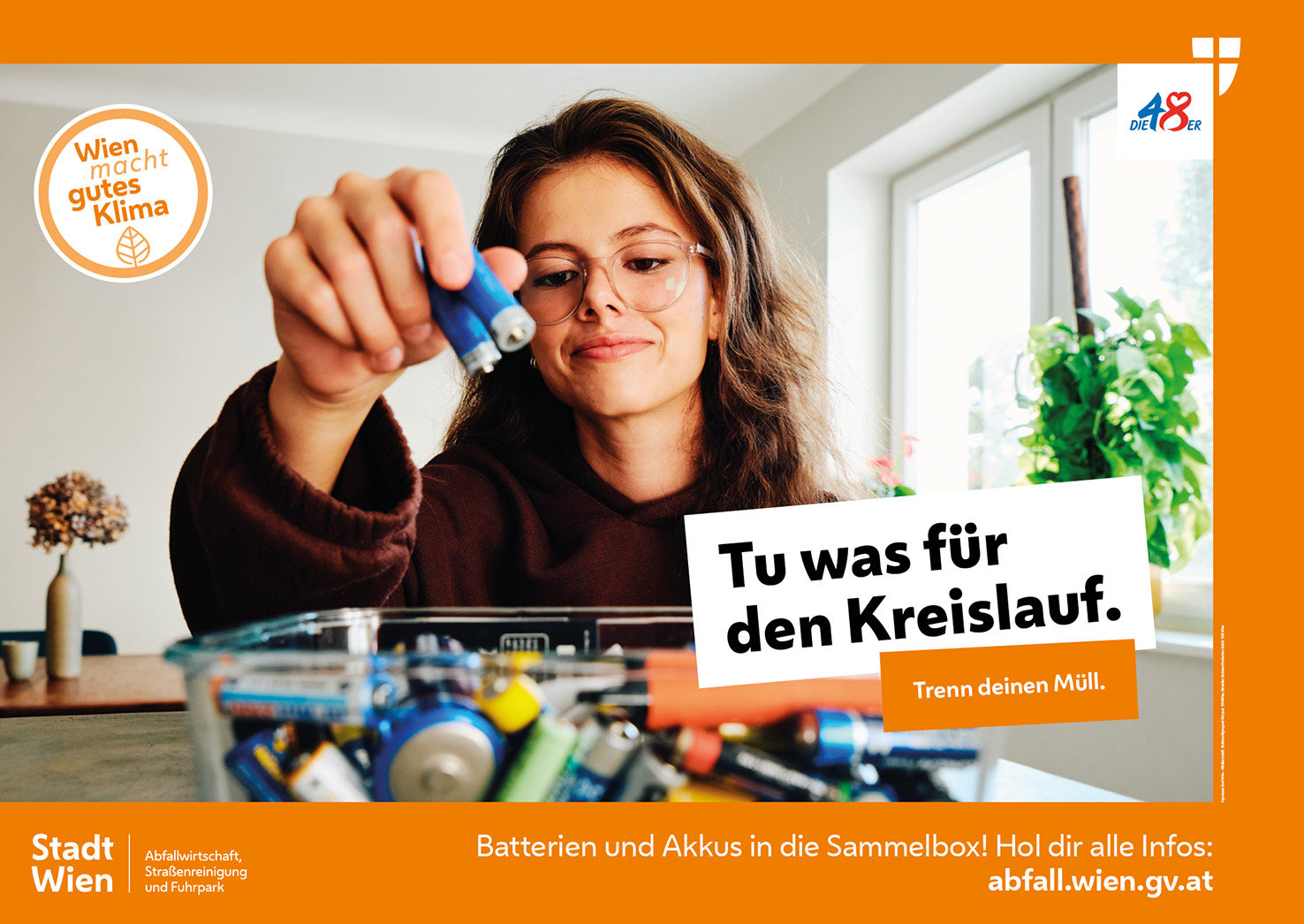 Anfang Oktober startet die 48er ihre neue Kampagne zur Aufklärung über richtige Mülltrennung. Mit dem Slogan „Tu was für den Kreislauf – trenn deinen Müll“ soll die Wiener Bevölkerung dazu angeregt werden, Wertstoffe wie Batterien und Akkus, Altspeiseöl, Papier, Karton und Sperrmüll richtig zu entsorgen. „Alle können damit einen einfachen, aber wichtigen Beitrag zu Kreislaufwirtschaft und Klimaschutz leisten: Ressourcen werden gespart und Wertstoffe im Kreislauf gehalten“, ist Klimastadtrat Jürgen Czernohorszky überzeugt.